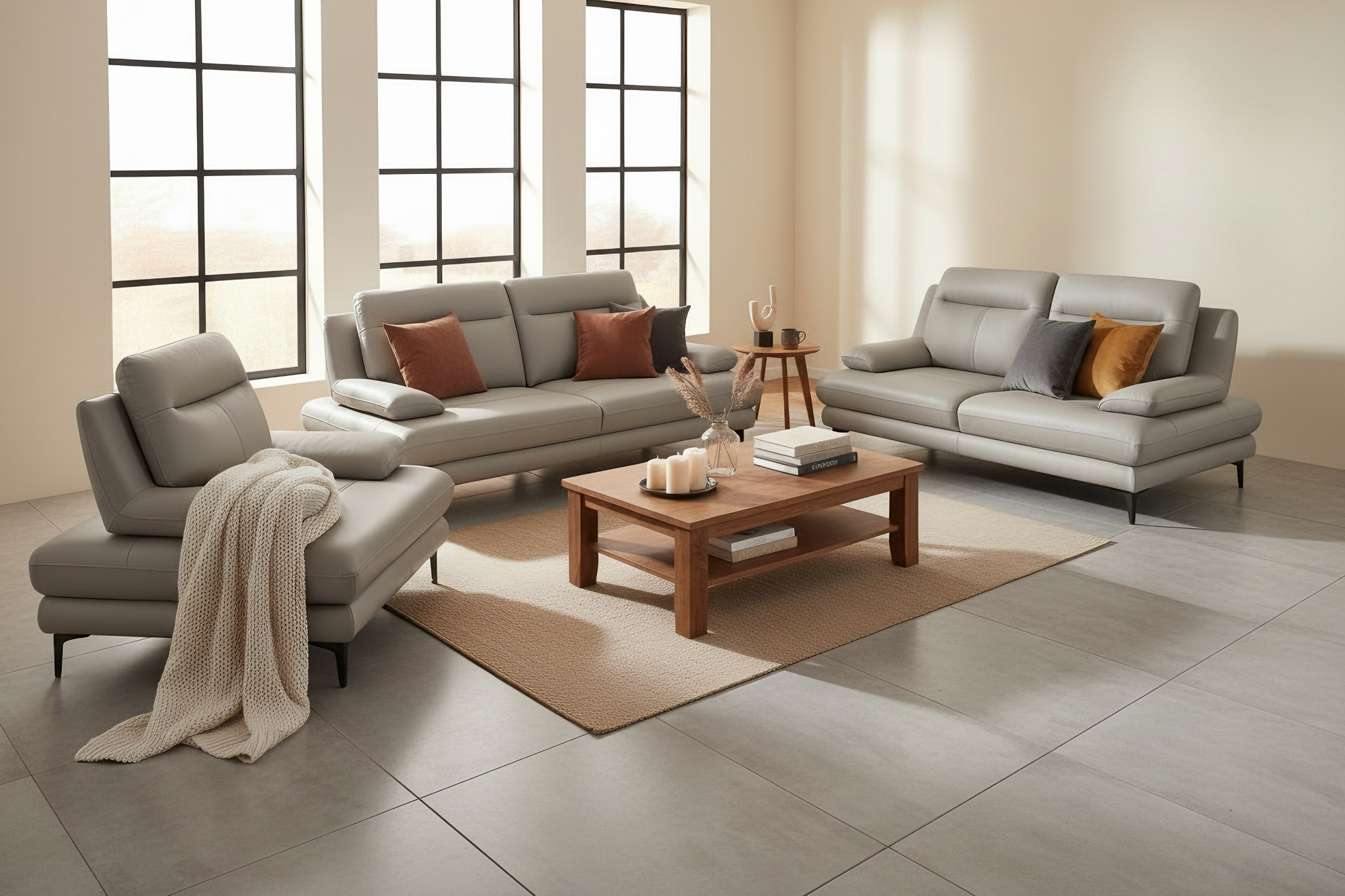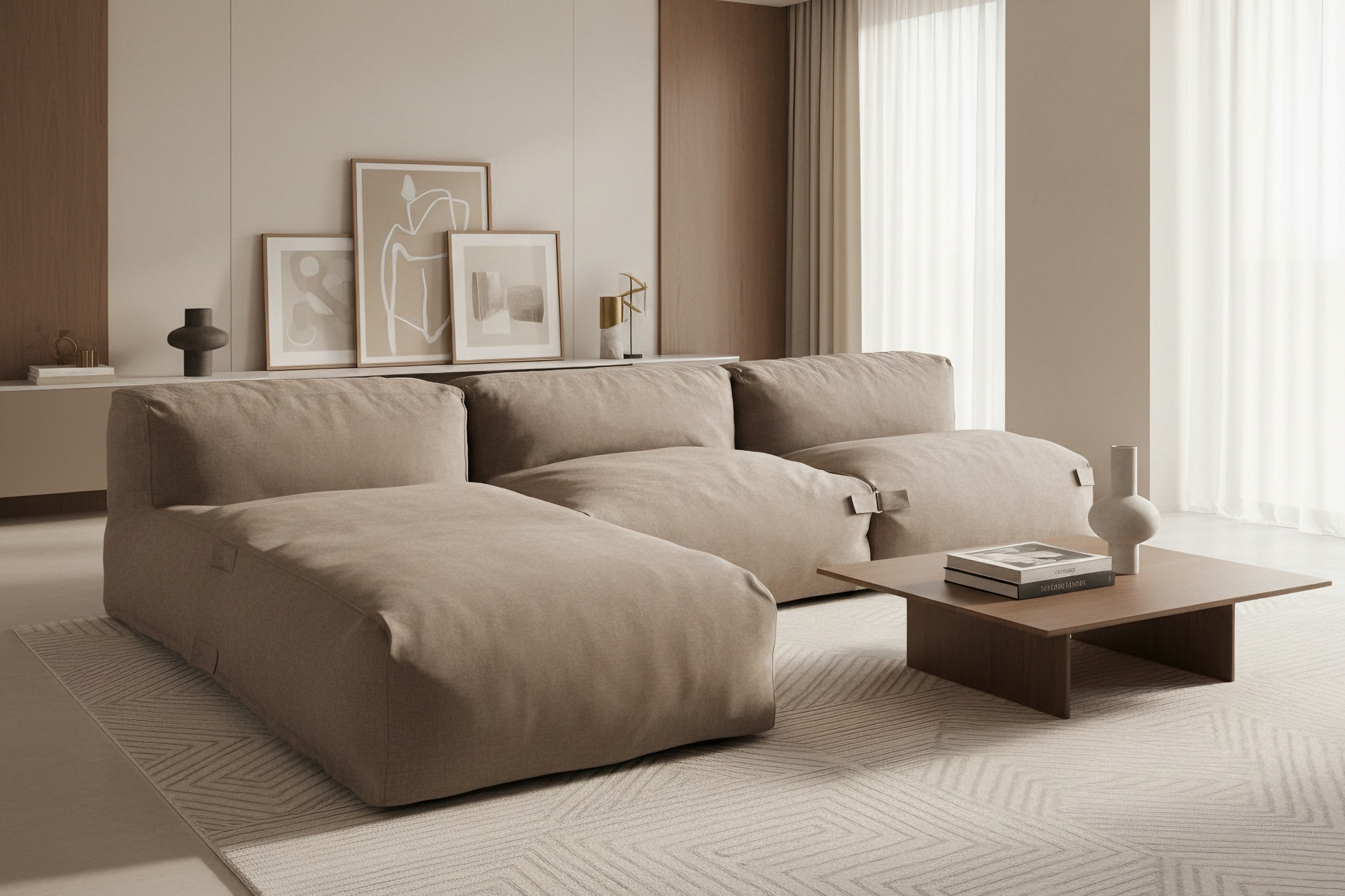 This spacious and modern L-shaped fabric sofa set, complete with a lounge chair, brings ultimate comfort and modular flexibility to your living room with its soft beige tones.