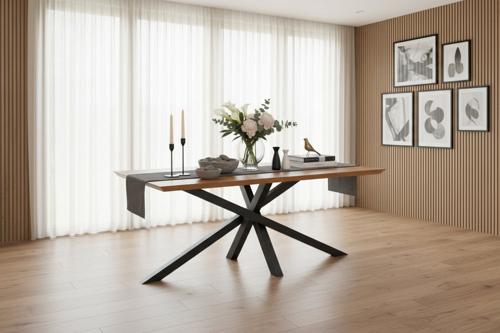 This rectangular dining table embodies the aesthetics of modern dining spaces with its minimalist design; the contrast between the white tabletop and the dark gray metal legs creates a refined visual balance.